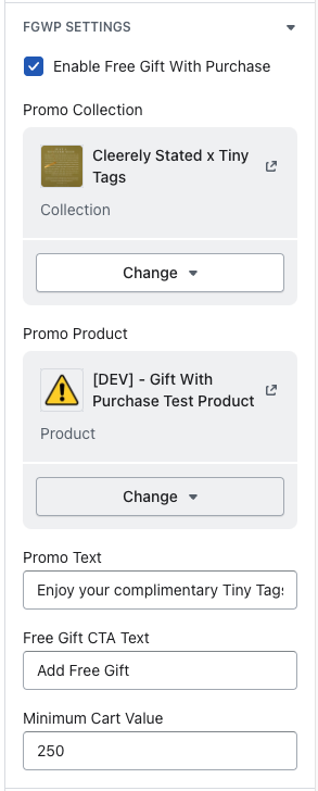 Promo collection - Can choose which collection you want the users to buy from in order to get the free gift. Can be a specific collection or just the 'all collection' if there is no required collection to get the free gift