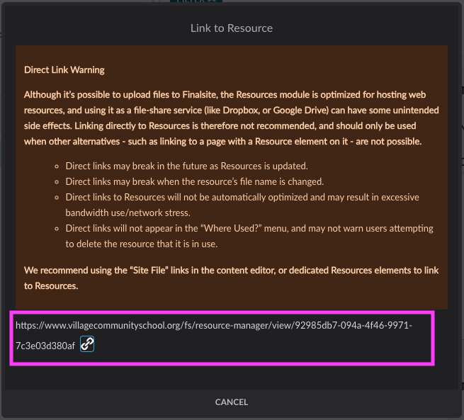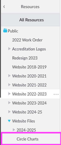 In Finalsite Admin, click on Resources tab on left sidebar. Next click "Resources". Next click "Website Files" then "Circle Charts"