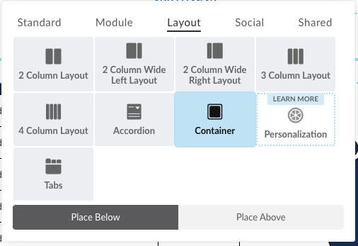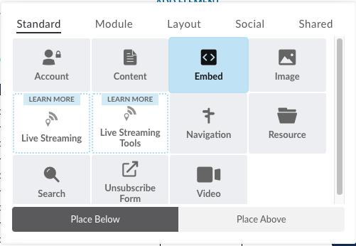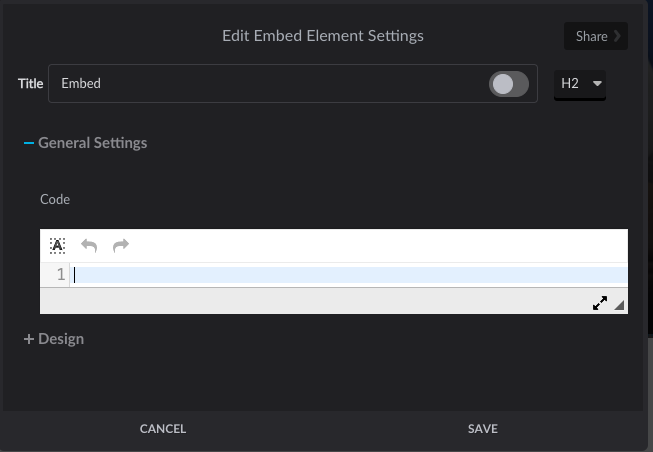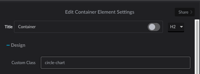 In the page's customizer, add a Container with the class name "circle-chart". Inside the container, add an Embed. Click the link to add the custom embed code. Add the following to the code box, replacing "[COPIED LINK HERE]" with the url you copied above: