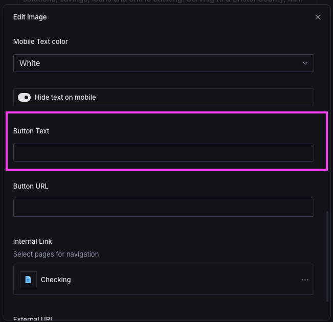 NOTE: an image CANNOT be linked to BOTH an internal link and external URL. ONE must be chosen. You must have a link but DO NOT enter text into the button text field.