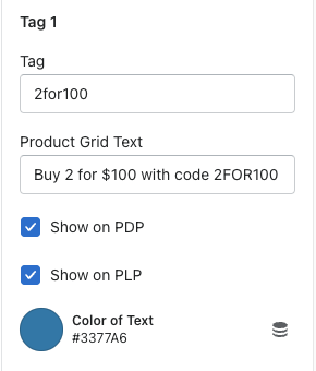 You will be able to add the specfic tags & text here that you want displayed on the PLP & PDP. You also have the option to just show it on one or the other.